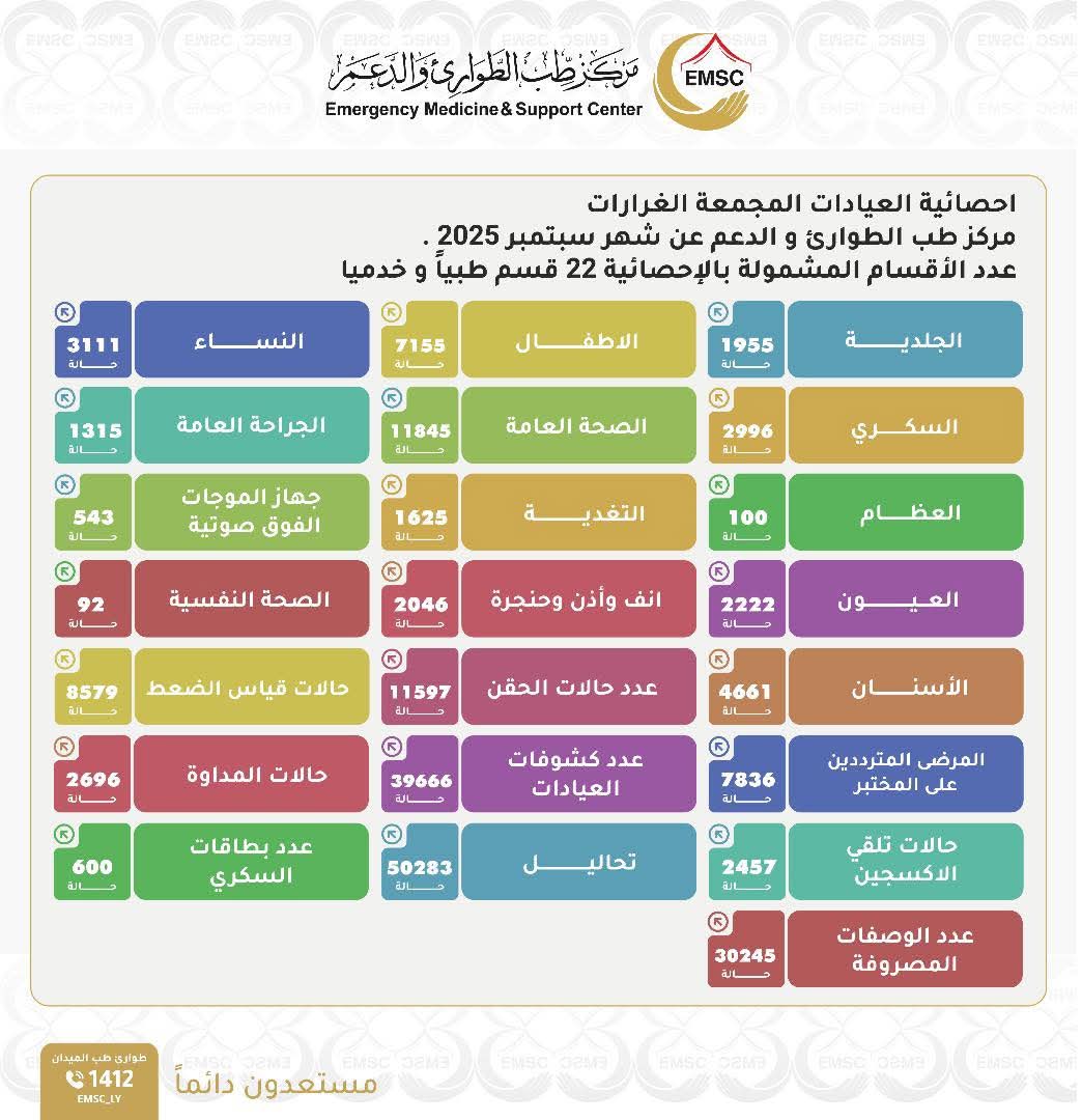 أنهت العيادات المجمّعة بالغرّارات التابعة لمركز طب الطوارئ والدعم شهر سبتمبر بإحصائية شاملة شملت 22 قسماً طبياً وخدمياً، عكست حجم الجهود المبذولة لخدمة المواطنين وتلبية احتياجاتهم الصحية على مدار الشهر.