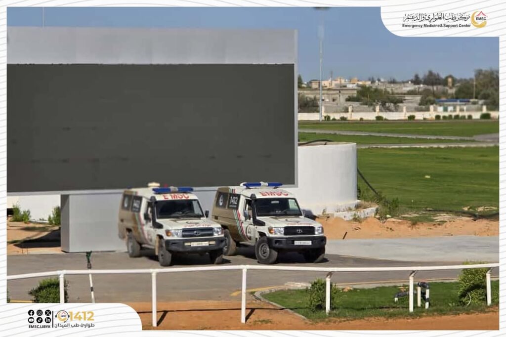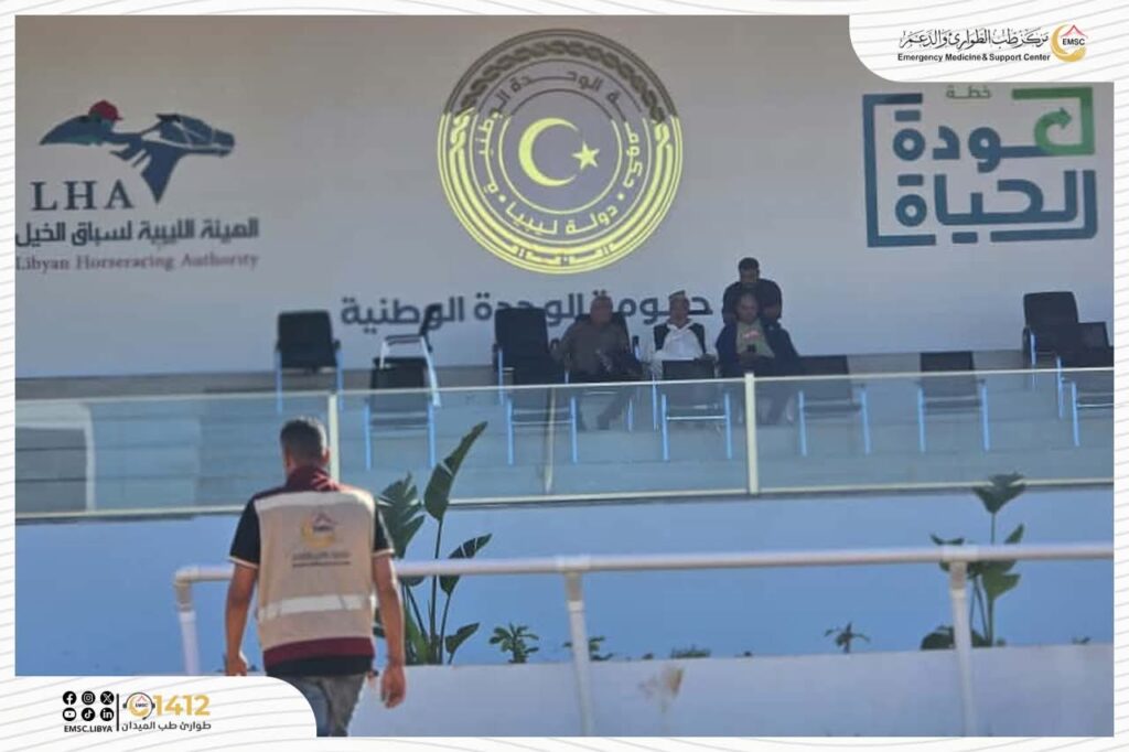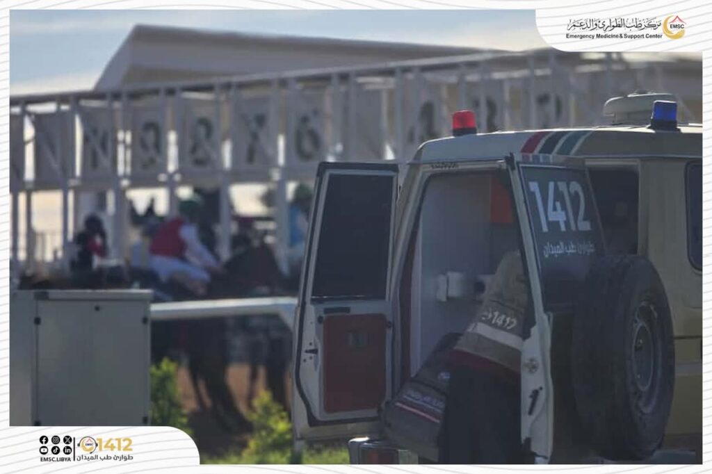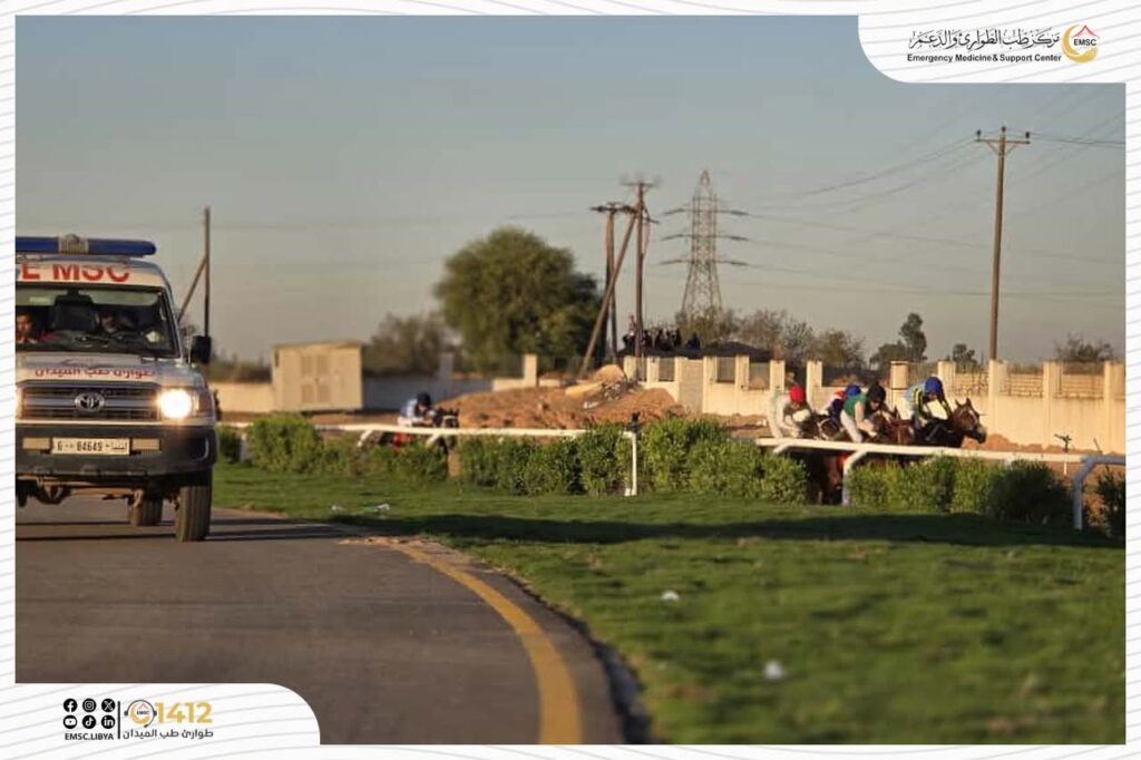 شهد سباق الفروسية بقصر بن غشير تأمين مركز طب الطوارئ والدعم – مكتب طرابلس طيلة فعاليات السباق، حيث تم تشغيل سيارات إسعاف ثابتة داخل الميدان لاستقبال الحالات وتقديم الإسعافات الأولية، إلى جانب سيارات أخرى تجوب المضمار مرافِقة للخيول والفرسان للتدخل السريع عند أي سقوط أو إصابة، بما ساهم في رفع مستوى الجاهزية والحفاظ على سلامة المشاركين والجمهور