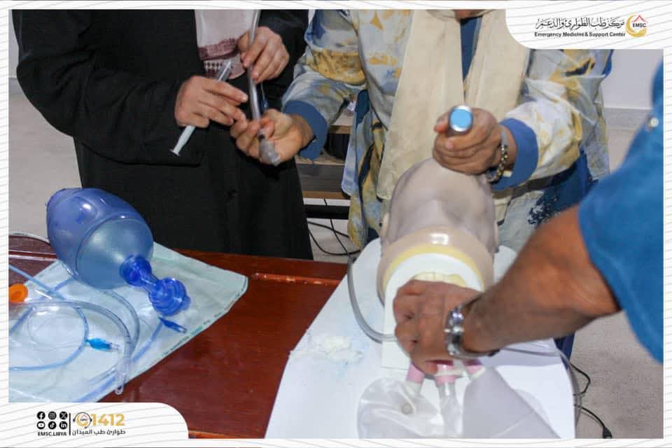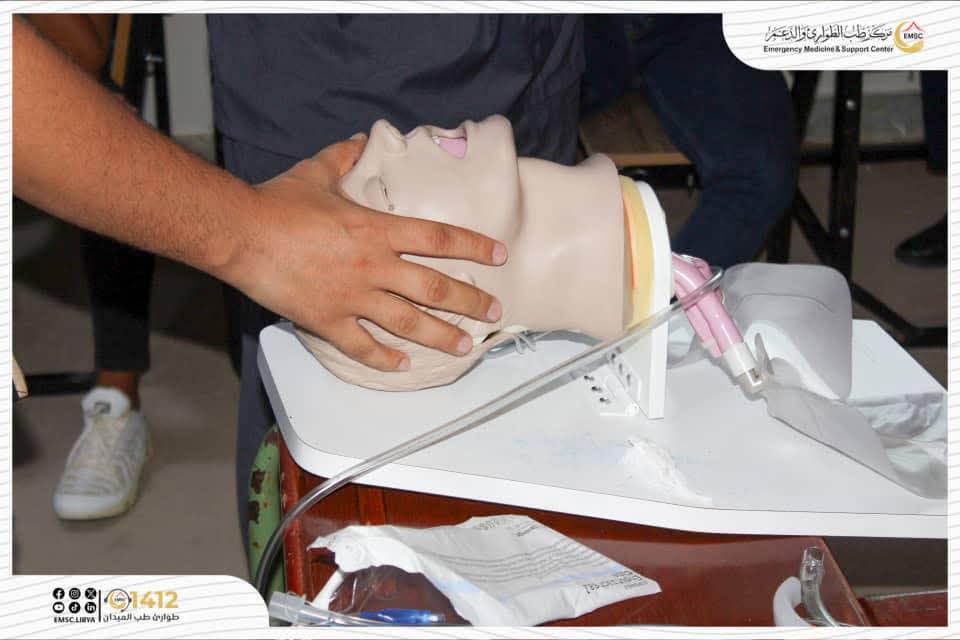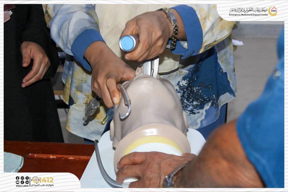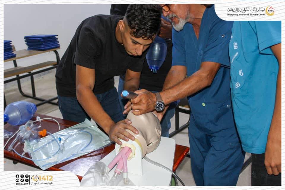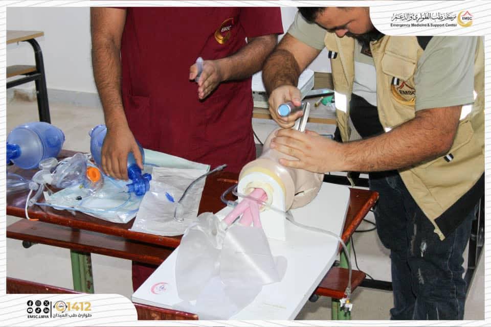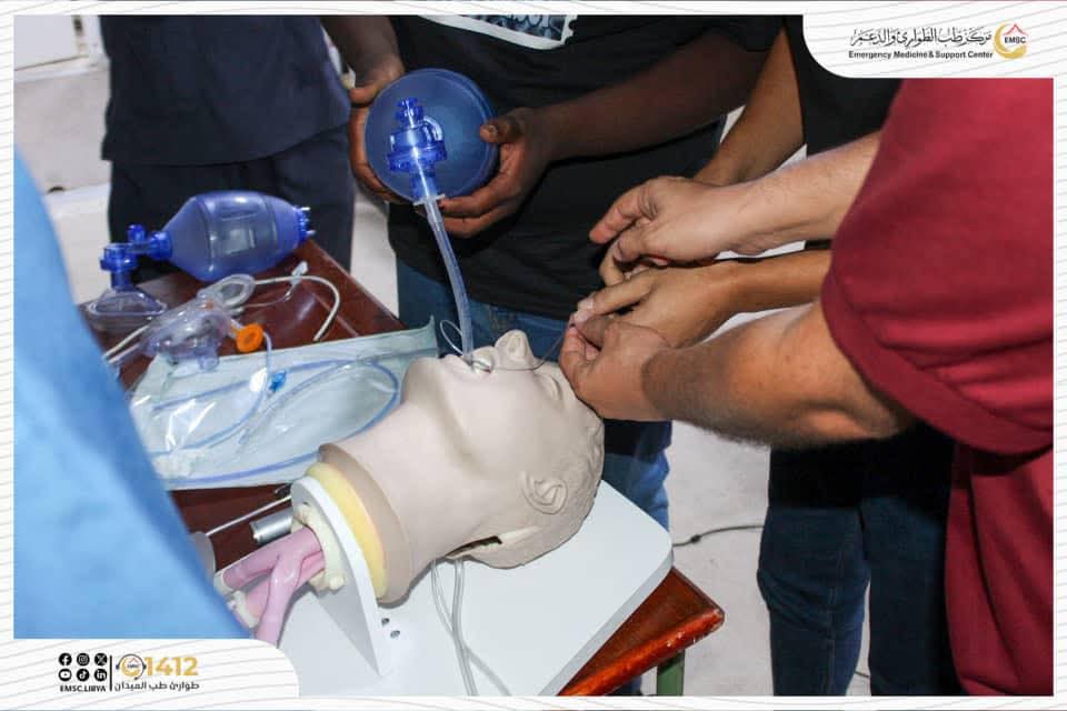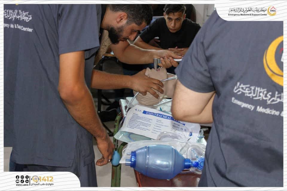 The training covered key practical topics including adult, child, and infant cardiopulmonary resuscitation (CPR), termination criteria, recovery positioning, and endotracheal intubation, under the supervision of Dr. Abuajila Al-Lafi, Emergency Medicine Specialist, and Dr. Abdelkader Ksheem, Intensive Care Specialist.