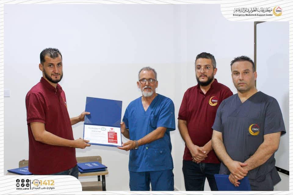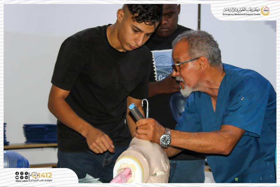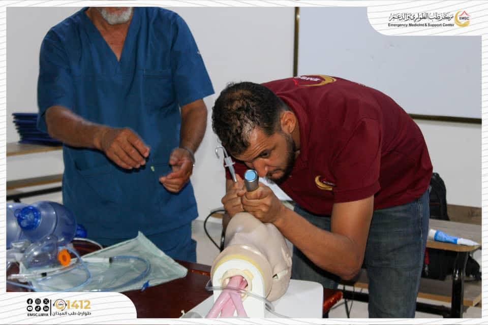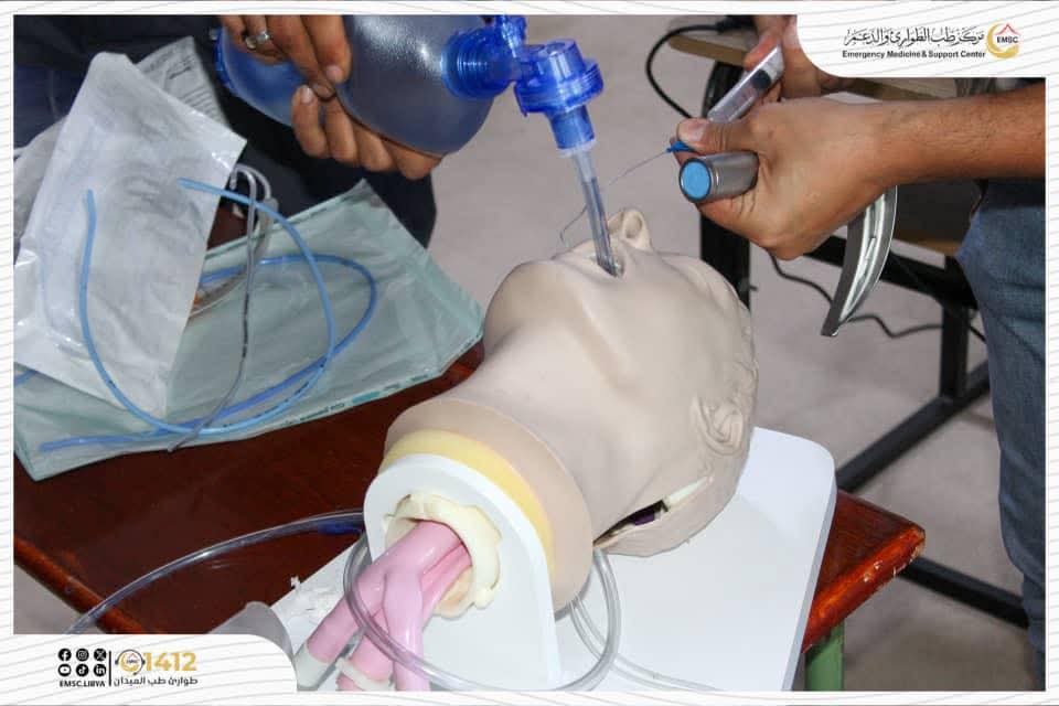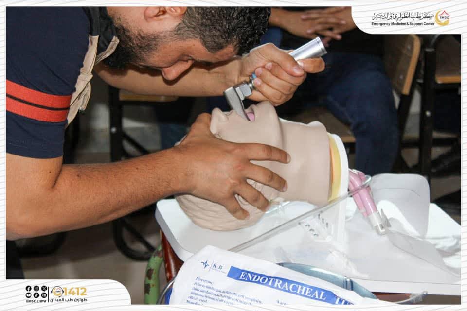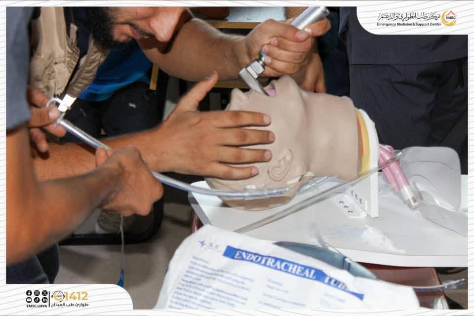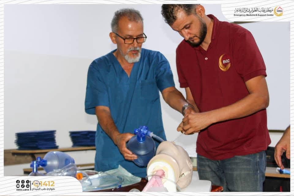 The training covered key practical topics including adult, child, and infant cardiopulmonary resuscitation (CPR), termination criteria, recovery positioning, and endotracheal intubation, under the supervision of Dr. Abuajila Al-Lafi, Emergency Medicine Specialist, and Dr. Abdelkader Ksheem, Intensive Care Specialist.