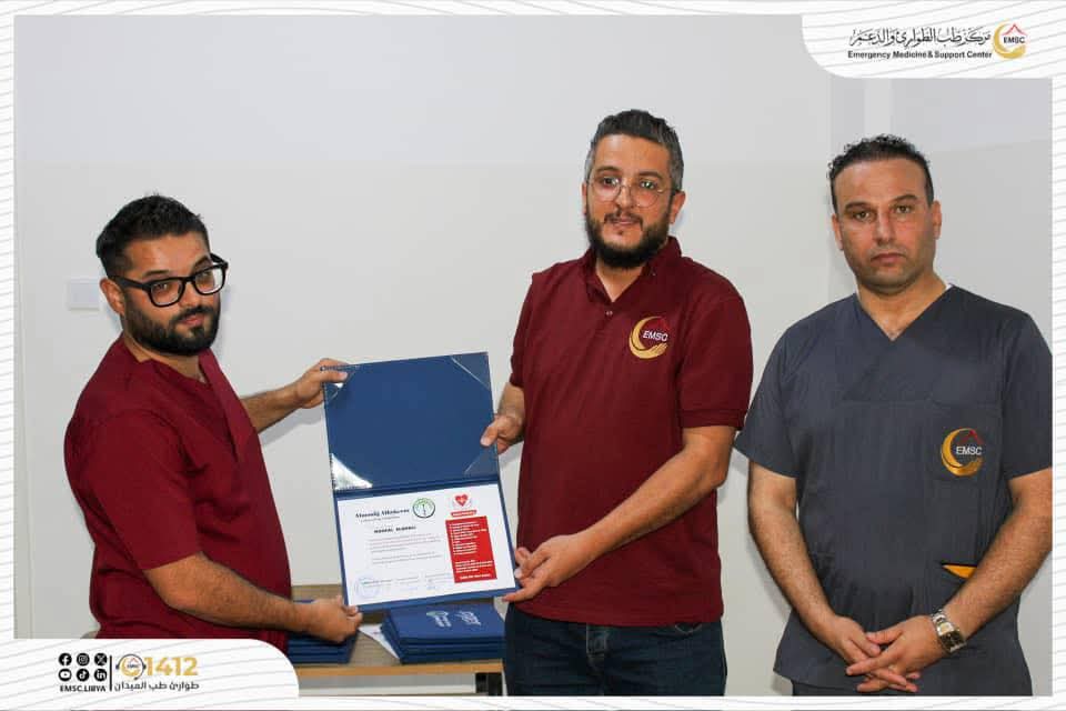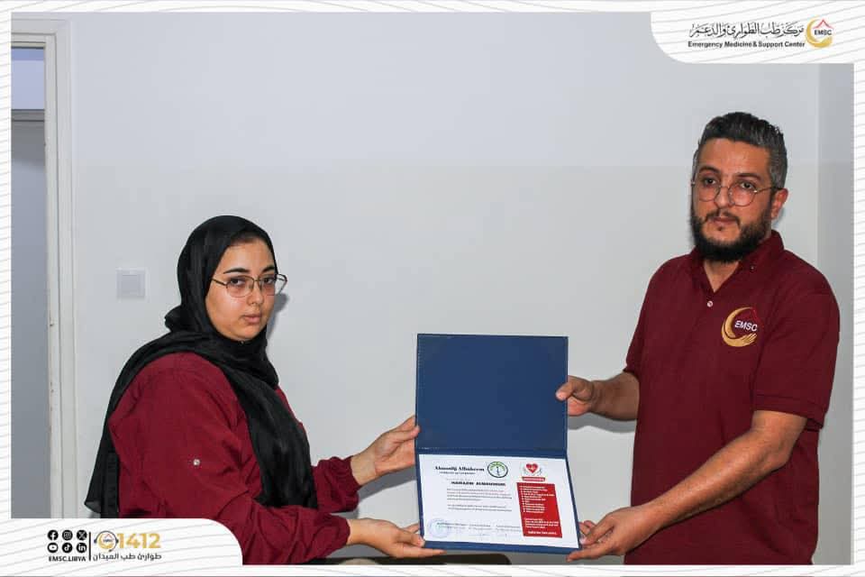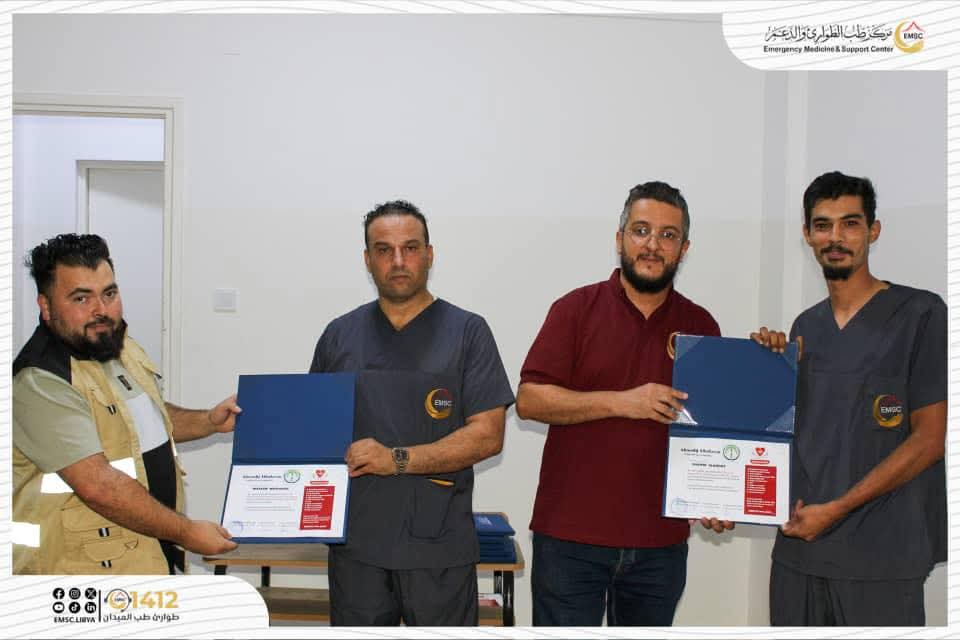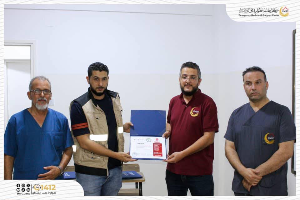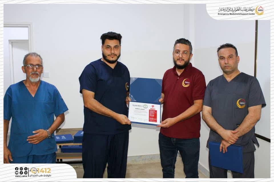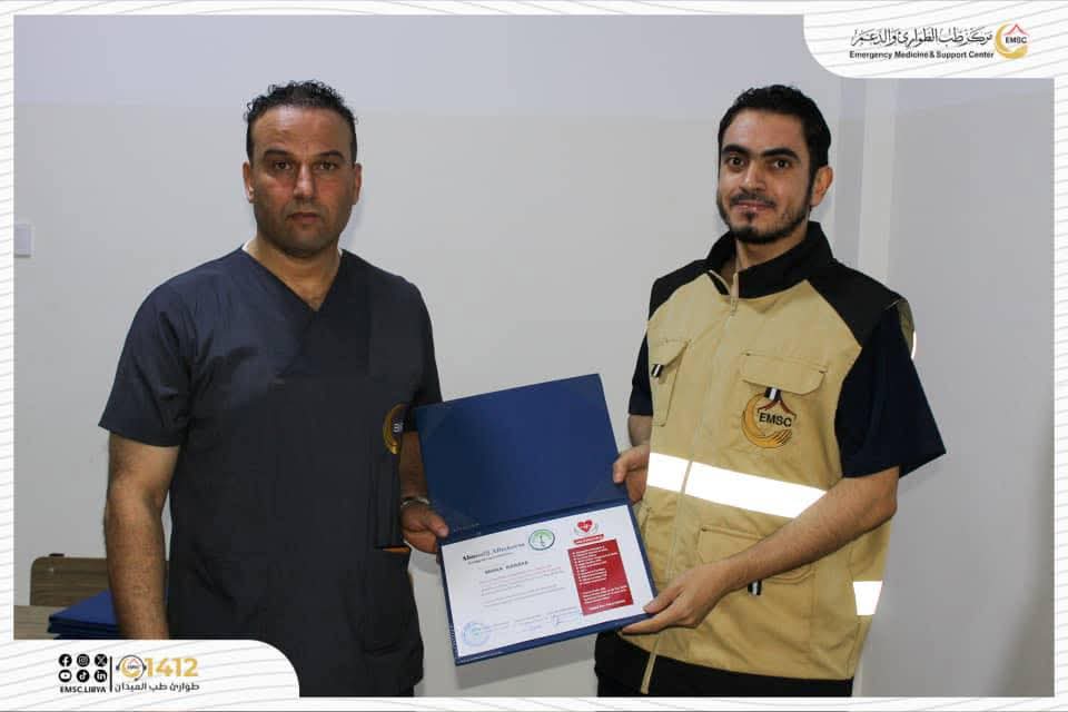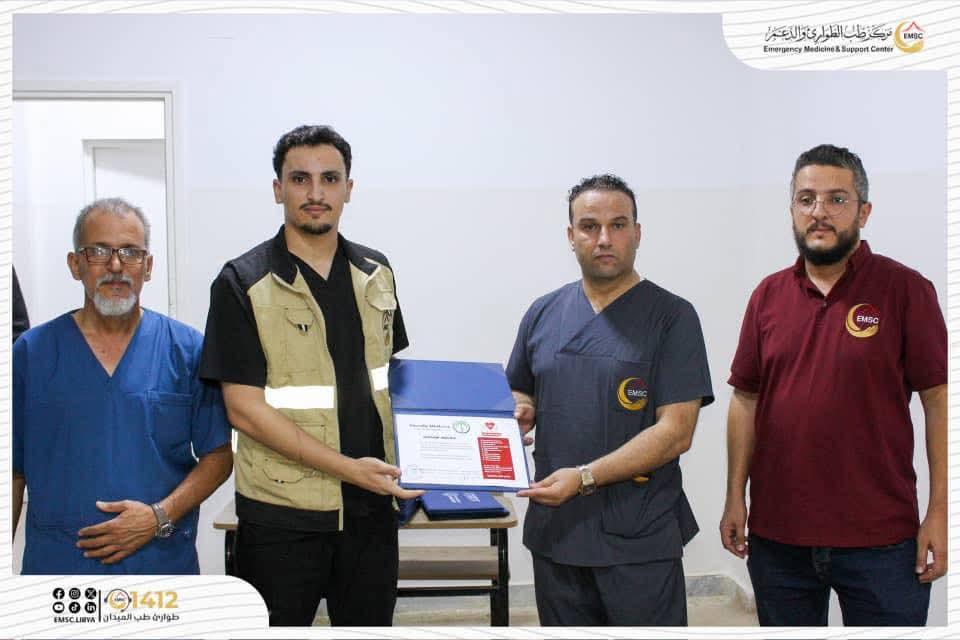 The training covered key practical topics including adult, child, and infant cardiopulmonary resuscitation (CPR), termination criteria, recovery positioning, and endotracheal intubation, under the supervision of Dr. Abuajila Al-Lafi, Emergency Medicine Specialist, and Dr. Abdelkader Ksheem, Intensive Care Specialist.