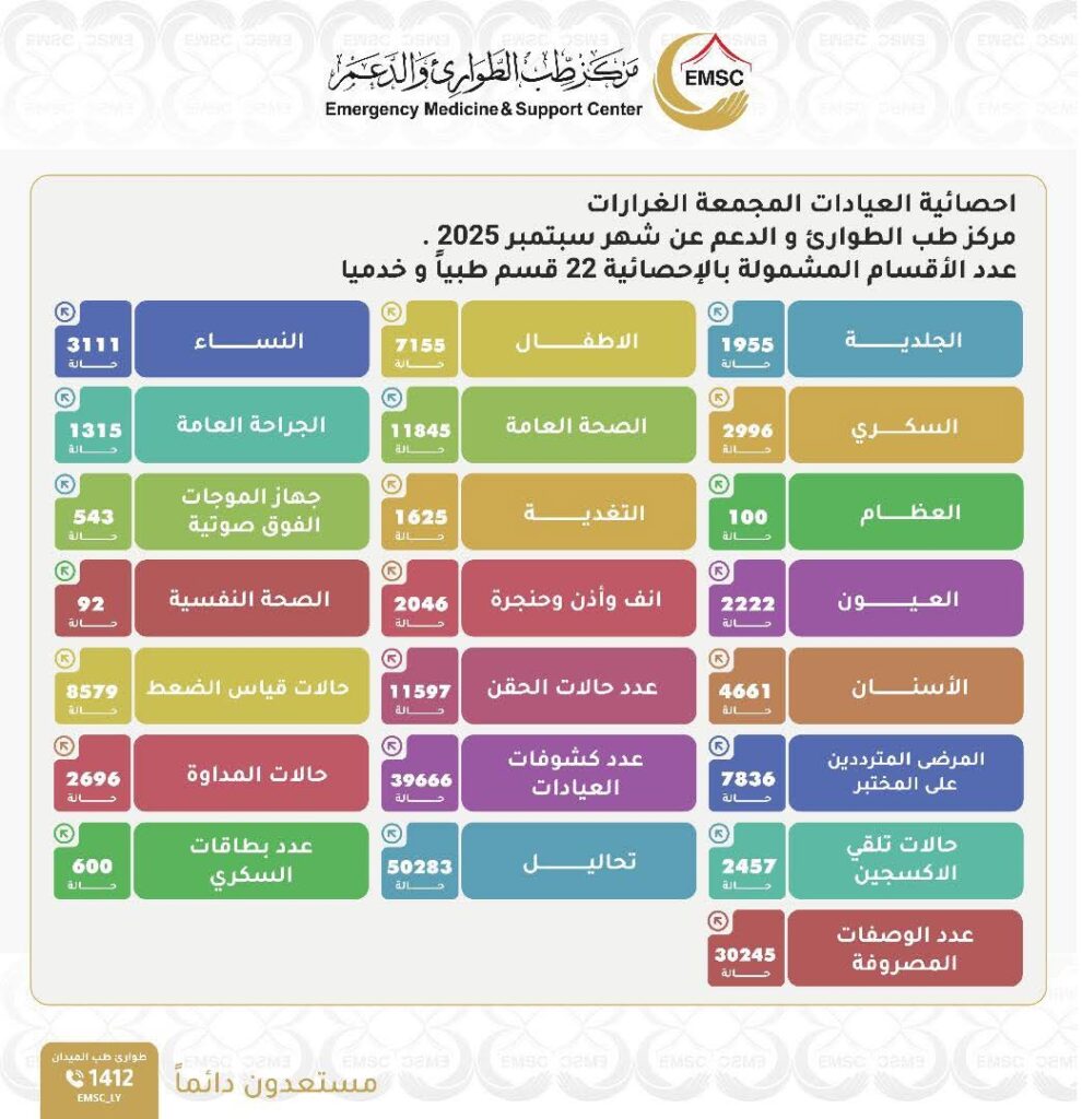 The Al-Ghurrarat Medical Complex, under the Emergency Medicine and Support Center, concluded the month of September with a comprehensive report covering 22 medical and service departments — reflecting the dedicated efforts made to serve citizens and meet their healthcare needs throughout the month. The Center extends its sincere appreciation to all medical, technical, and administrative […]