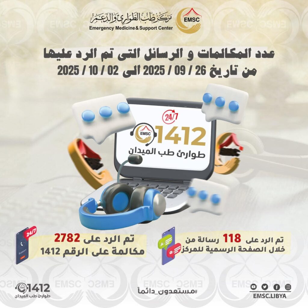 As part of its ongoing commitment to serving citizens and providing emergency medical support across Libya, the Emergency Medicine and Support Center continued its 24/7 operations through the toll-free number 1412 and its digital services. • A total of 2,782 emergency calls were received and handled via the toll-free number 1412.• 118 messages received through […]