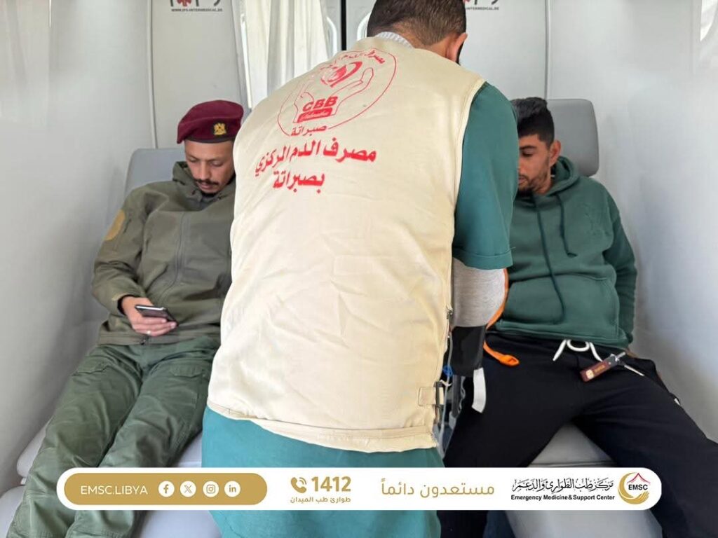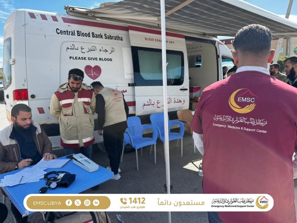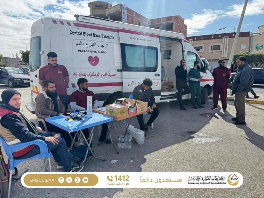 The city of Sabratha witnessed the organization of a blood donation campaign supervised by the Emergency Medicine and Support Center – Sabratha Office, in coordination with the Central Blood Bank – Sabratha and with the active participation of the Anti-Security Threats Agency. The initiative reflected a strong spirit of cooperation and solidarity among institutions in service of the community.