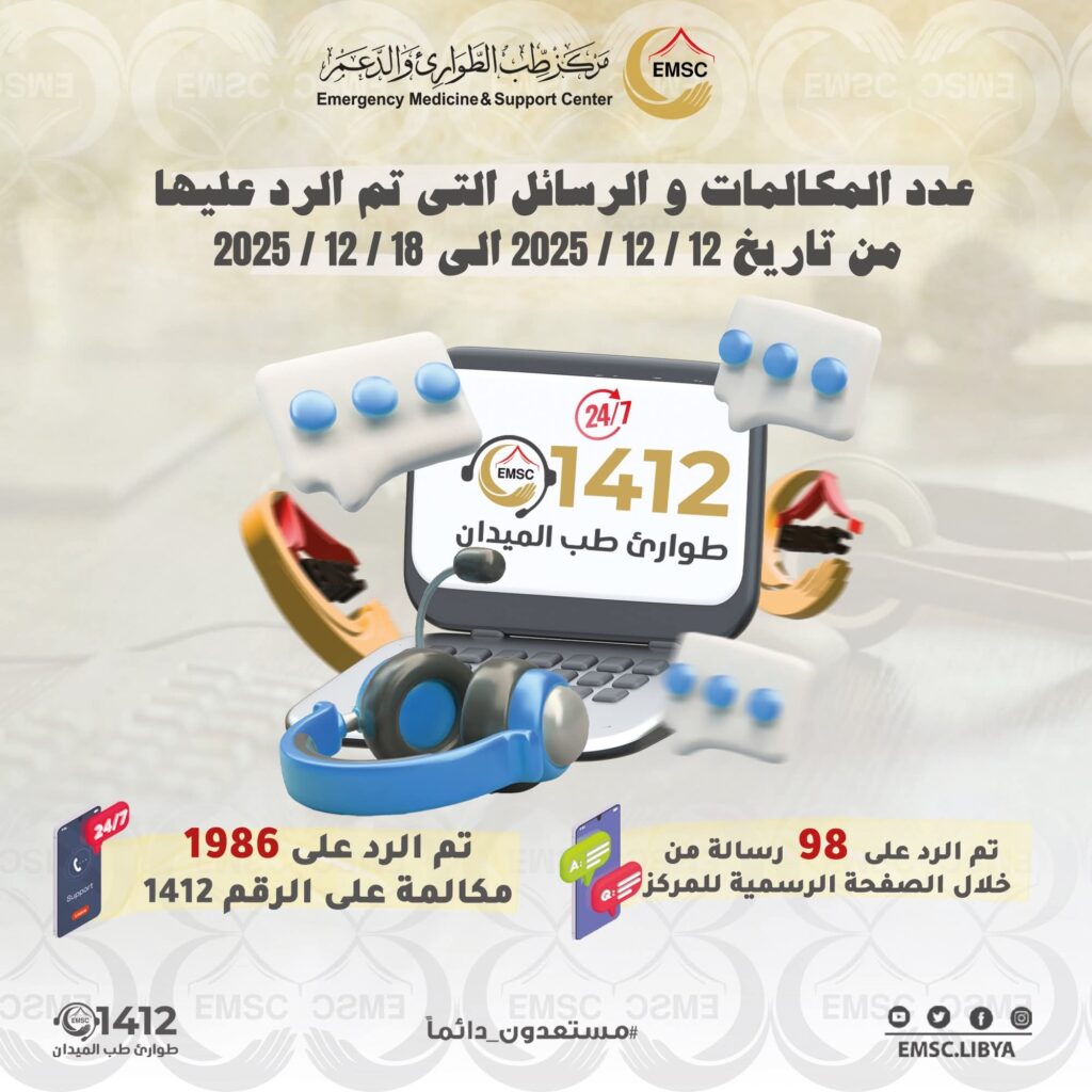 As part of its ongoing commitment to serving citizens and providing emergency medical support across Libya, the Emergency Medicine & Support Center continued its operations around the clock through the toll-free number 1412 and its digital communication platforms. We remain at your service 24 hours a day, 7 days a week, always ready to respond […]