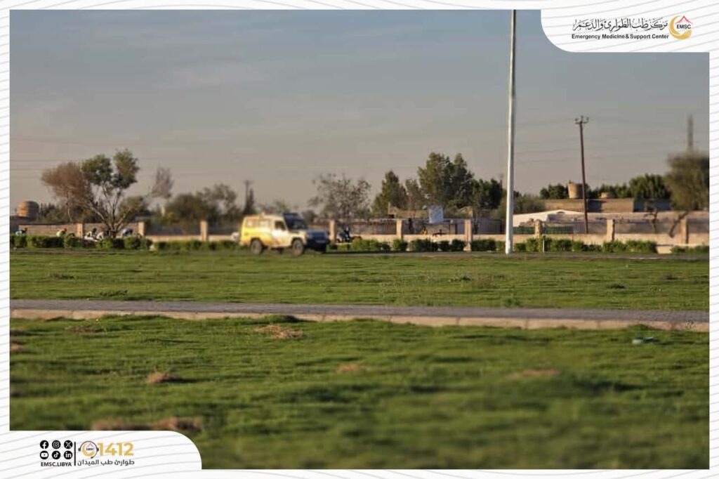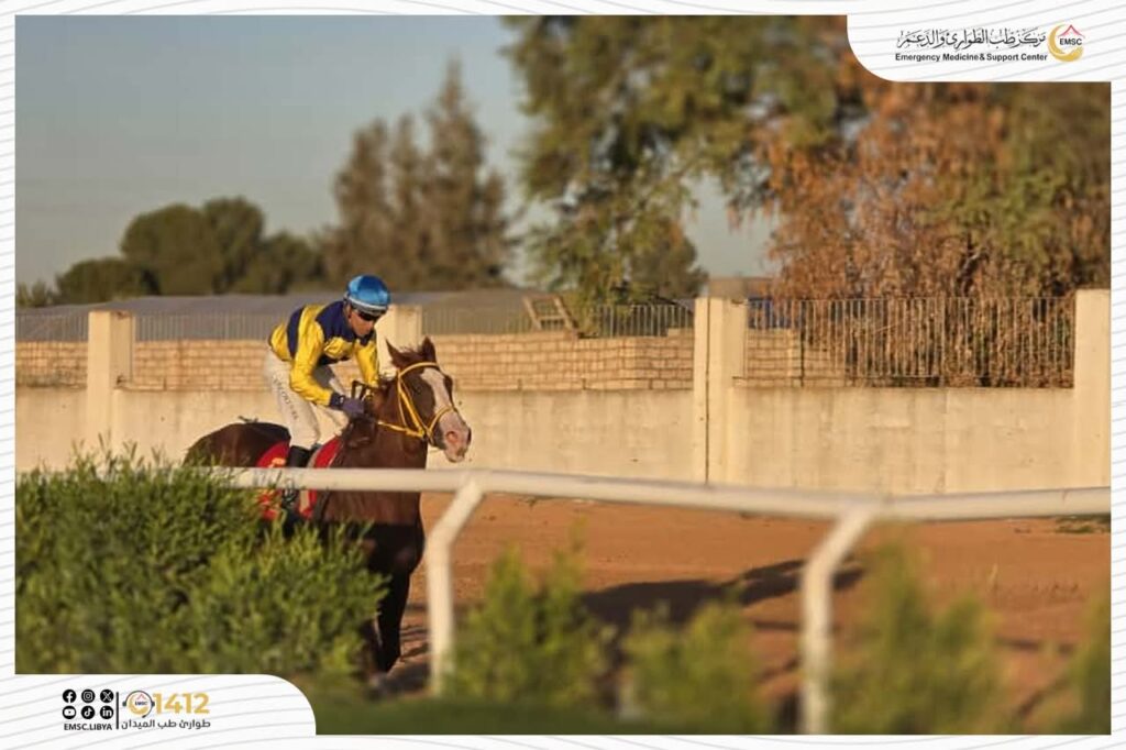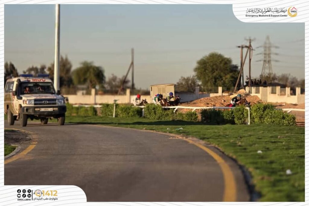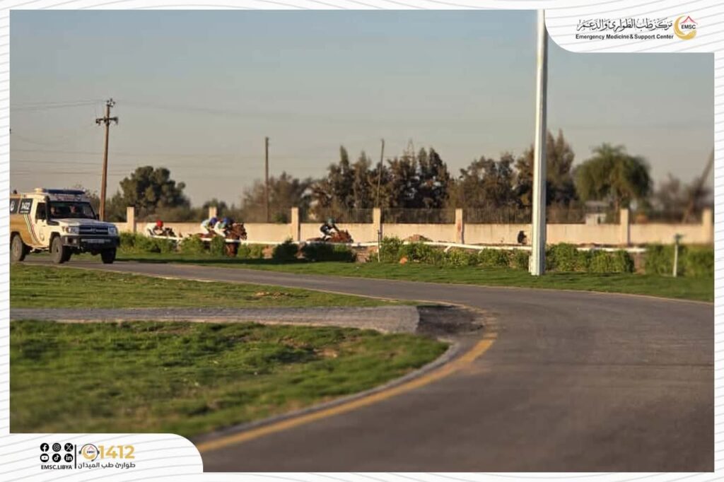 The Emergency Medicine and Support Center – Tripoli Office provided full medical coverage during the equestrian race in Qasr Bin Ghashir. Ambulances were positioned inside the field to receive cases and provide first aid, while additional mobile units patrolled the track alongside the horses and riders to ensure rapid intervention in the event of any fall or injury. This contributed to enhancing readiness and maintaining the safety of both participants and spectators.