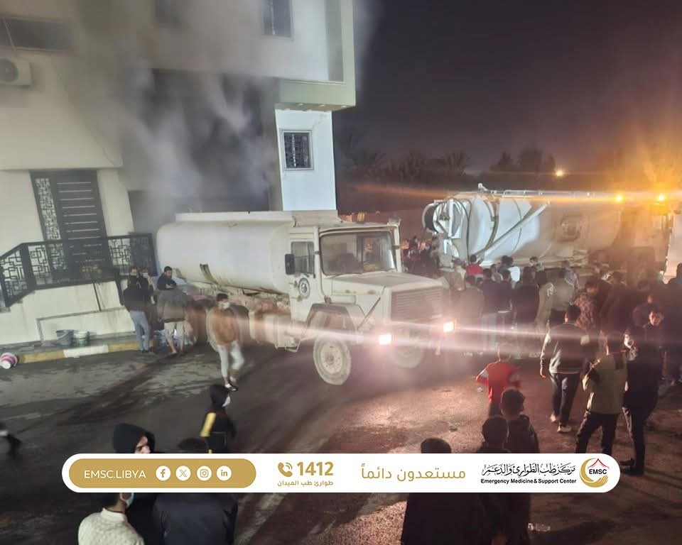 On Tuesday evening, February 3, 2026, the Operations Room of the Emergency Medicine and Support Center – Bani Walid Office received an urgent report of a fire breaking out inside the Flamingo Complex on Al-Saqiya Street.