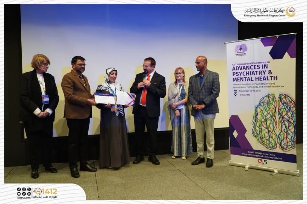 The Emergency Medicine and Support Center participated in the 42nd International Conference on Advances in Psychiatry and Mental Health, held in Dubai from November 10–11, 2025. The Center was represented by the Manager of the Mental and Social Health Department and a team of specialists in psychiatry and social support, in addition to members with legal expertise, in line with the conference’s objective of bringing together experts in mental health and law to explore prospects for integration between the two fields.