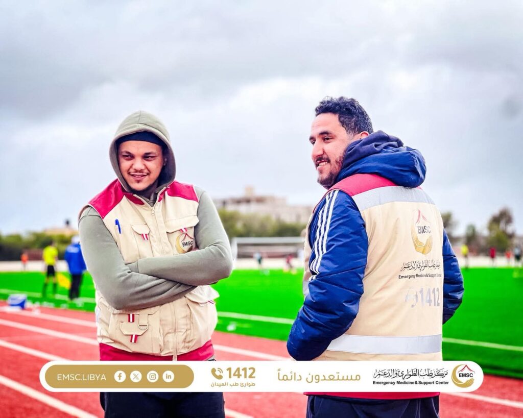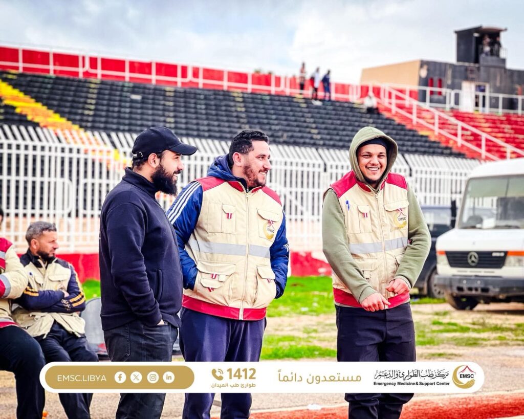 The Emergency Medicine and Support Center – Al-Marj Office continues its active presence at sports venues across the city through its sports injury response team, demonstrating a high level of readiness and professionalism.