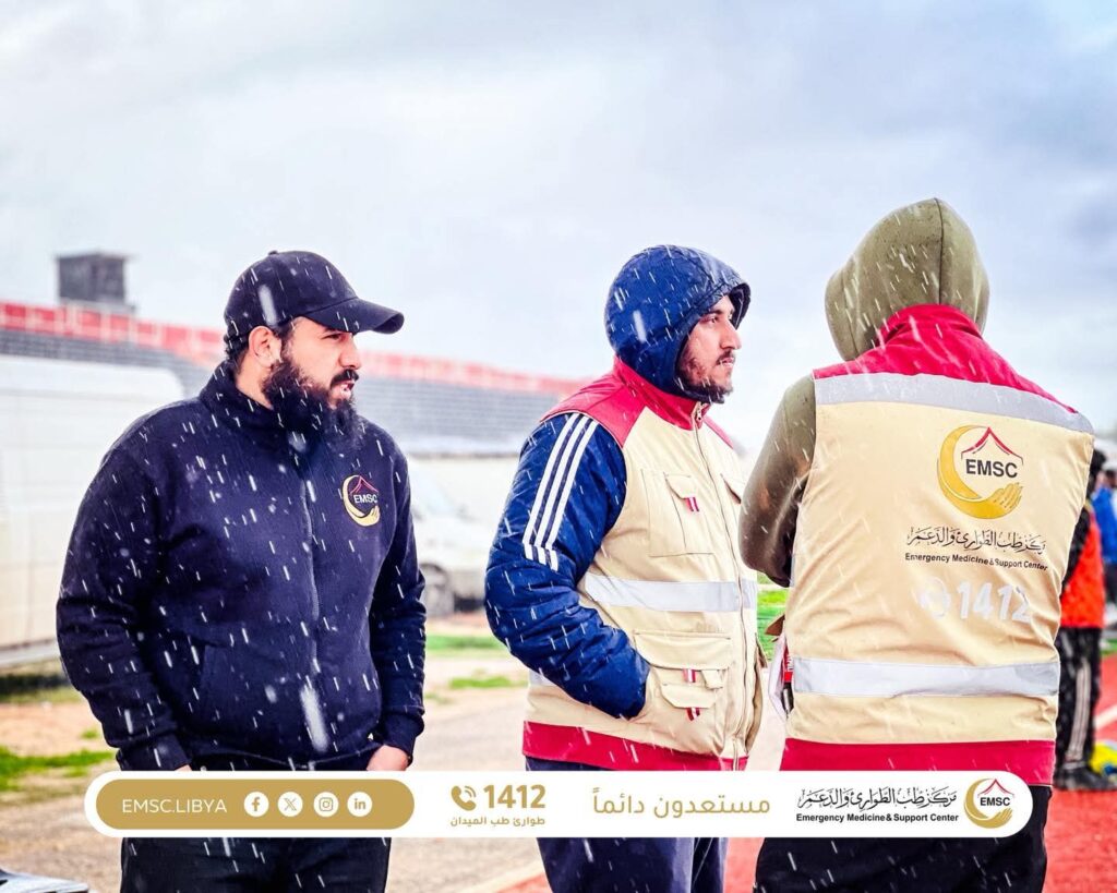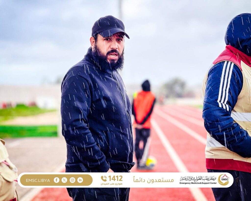 In a single day, despite rainy weather conditions, the medical team provided coverage for two consecutive matches. The first was a Libyan Premier League football match between Al-Saqoor and Al-Anwar, followed by a Libyan Basketball League game between Al-Morouj and Al-Nasr.