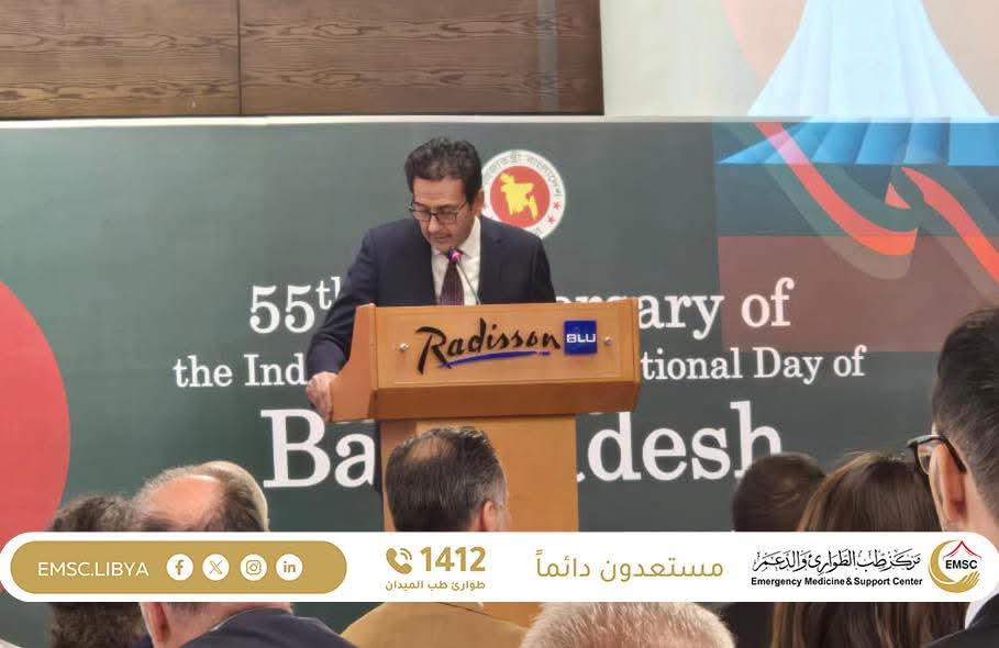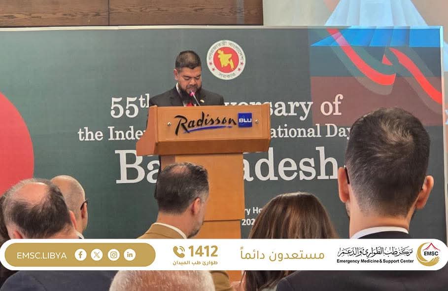 As part of its official presence and active participation in international events, the Emergency Medicine and Support Center joined the celebration of the 55th anniversary of the independence of the People’s Republic of Bangladesh. The center was represented by its official spokesperson, following a gracious invitation from His Excellency Mohammad Habibur Rahman, the Ambassador of Bangladesh to Libya, with the presence of several representatives from diplomatic missions accredited in Tripoli.