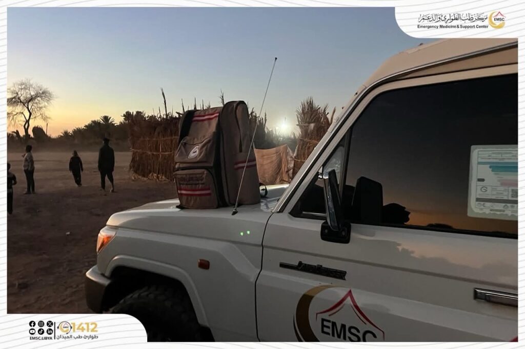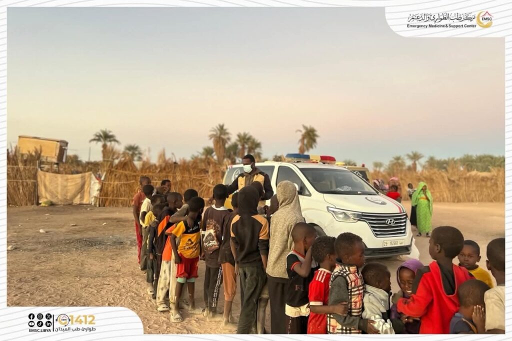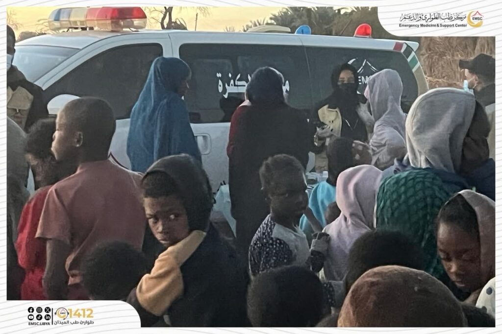 As part of its ongoing humanitarian efforts, the Emergency Medicine and Support Center – Al-Kufra Office organized a medical and humanitarian convoy targeting Sudanese displaced families residing in a remote area, with the aim of delivering essential healthcare services directly to their locations.