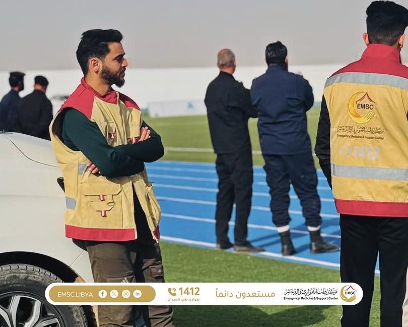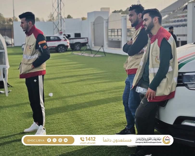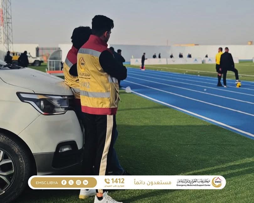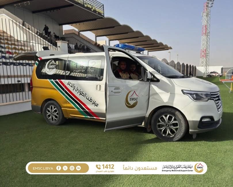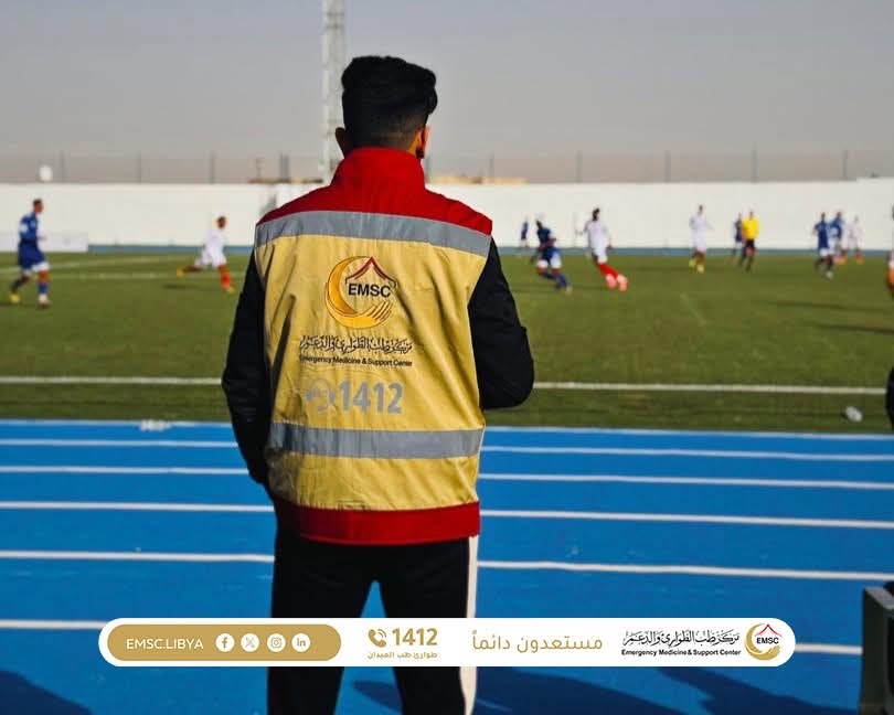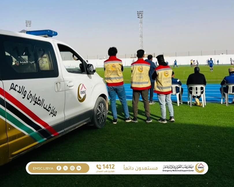As part of its ongoing efforts to ensure public safety and support sporting events, the Emergency Medicine and Support Center – Zintan Office carried out its field duties to provide medical coverage for the eighth round of the Libyan Premier League. The match was held at Zintan Stadium and brought together Ittihad Gharyan and Al-Olympi.