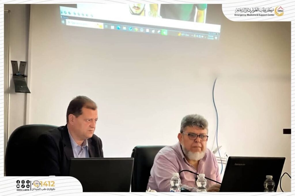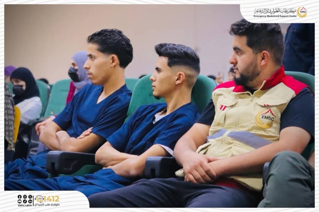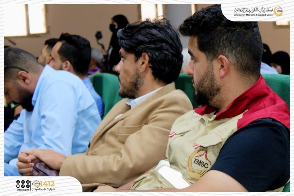 The Emergency Medicine and Support Center – Tarhuna Office participated on Saturday, 15 November 2025, in an awareness lecture hosted by the Faculty of Medicine at Al-Zaytouna University, in cooperation with the Office of Entrepreneurship and Innovation and the Libyan Youth Development Organization, as part of the “Qudwa” campaign, under the title:
