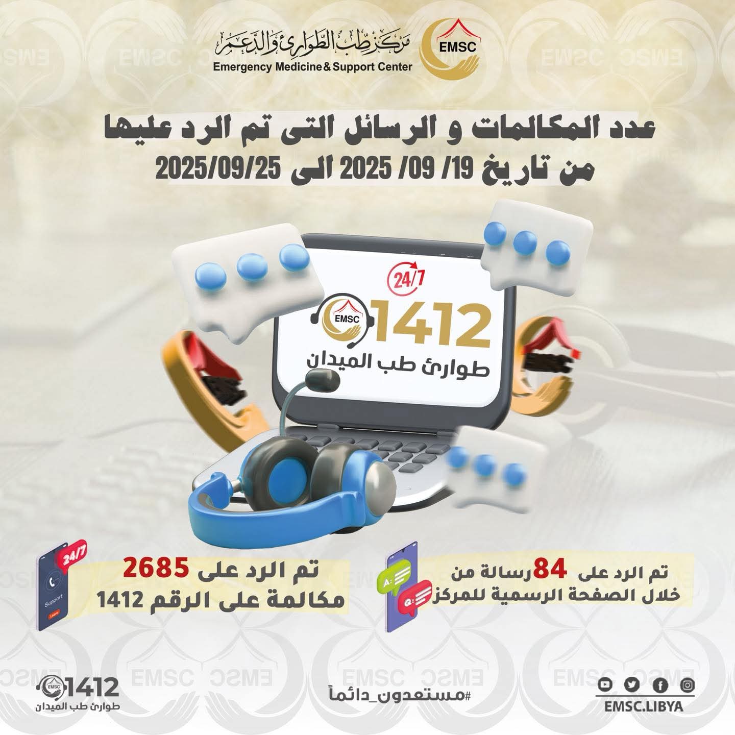 As part of its continuous commitment to serving citizens and providing emergency medical support across Libya, the Emergency Medicine & Support Center continued its 24/7 operations through the toll-free number 1412 and its digital services.